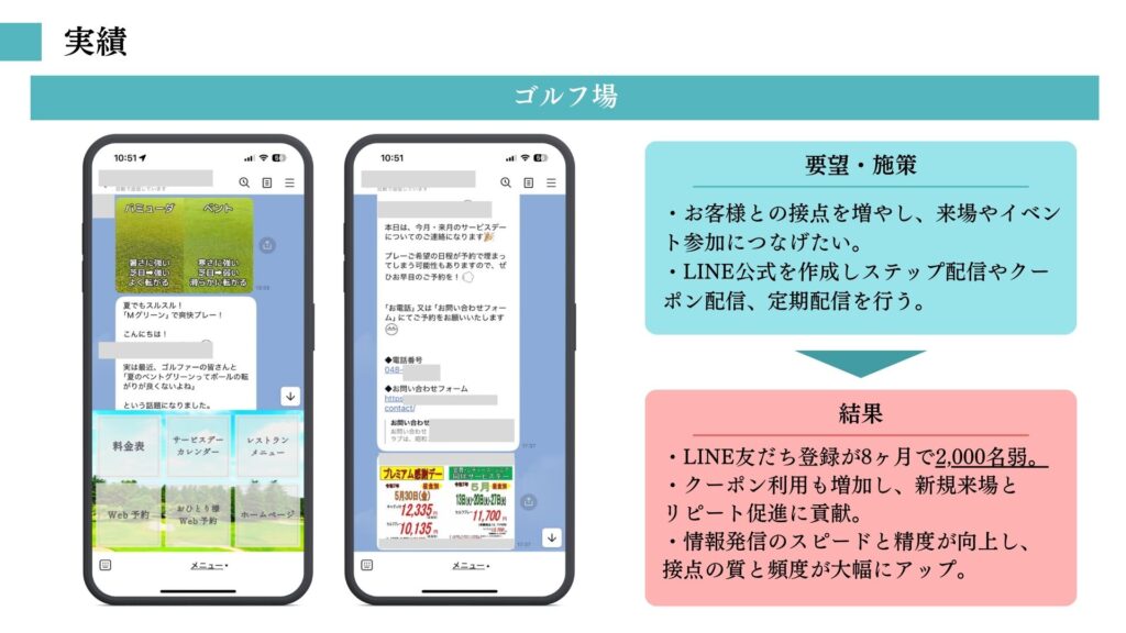 LINEを通じて「クーポン」「キャンペーン情報」「イベント案内」などをタイムリーに届けられるようになり、お客様との接点が確実に増えています。