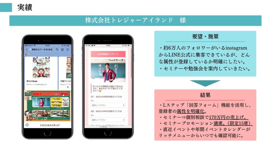全体の流れがわかりやすくなり、セミナー→LINE登録→個別相談という動線が機能し始めました。